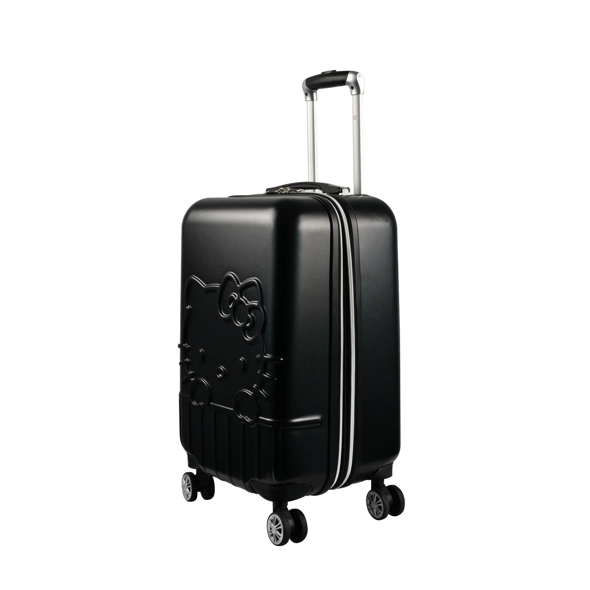 Keep your belongings conveniently and efficiently stored in one place while breezing through the airport or hotel lobby with this adorable Hello Kitty black rolling luggage on wheels. Designed with a stylish, eye-catching Hello Kitty embossed aesthetic, this hard shell carry on luggage features eight 360 degree multi-directional spinner wheels with to allow for smooth travel over all types of textured surfaces, and the lightweight hard sided luggage with spinner wheels features a retractable pull handle so you can reach your destination without hassle. The hard case luggage features a sizable polyester-lined main zip compartment for easy packing, a zip wet dry compartment for personal essentials, 2 mesh zip pockets for small accessories, clothing compression straps to keep clothing from wrinkling, and features expandable storage with 2-inch zipper gusset. The light weight carry on luggage roller features a hard shell ABS plastic case which protects your luggage and is easy to spot clean to keep the carry on luggage with wheels looking stylish during travel. The travelling bag with wheels measures 14 W x 8 D x 21 H in inches, and weighs 10 lbs.