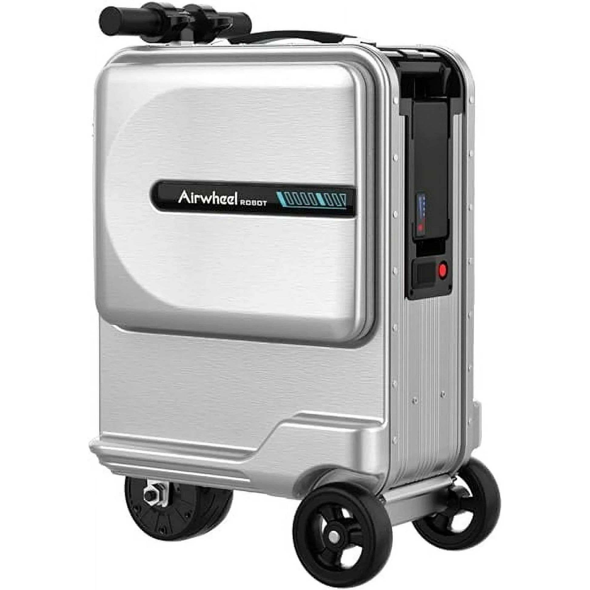 20inch electric suitcase that follows you, manned travel suitcase, 26L large capacity unpacked on the side, reasonable partitioning and convenient access. Retractable handle, configuration gear adjustment, suitable for users of different heights. ABS+PC 3-layer composite material, light and wear-resistant, load 220 Pounds. The main frame of the box is made of aviation-grade aluminum alloy, and the strength and hardness are treated with special technology to allow the product to be used in a variety of harsh conditions. Equipped with a push rod motor with small size and large torque; Smart handle, integrated acceleration handle and brake handle, it can realize one-key electric folding, and it can be retracted freely. 73.26WH lithium battery can meet the requirements 5-6 MPH manned riding while ensuring boarding. It is equipped with a USB interface and can be charged at any time. It can be used as a mobile power source, and convenient for travel 100W brushless motor, quieter, more sensitive, accurate torque to diameter ratio, maximum speed 6 mph . TSA code lock, LED ambient light, reversing function, front decorative baffle